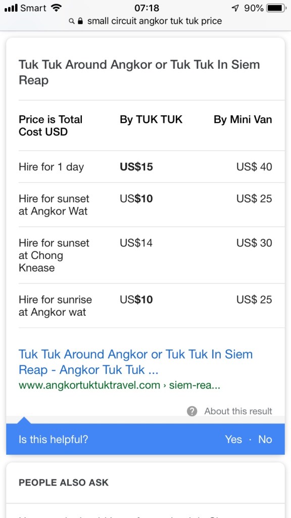 On the second day in Siem Reap we started visiting the complex of Angkor’s temples (UNESCO World Heritage Site), one of the widest religious monuments in the world (162.6 hectares, as you can imagine we visited a quarter of a quarter of a quarter of the place). On our first evening we got a Grab from the town centre back to our hotel. Grab is an app which offers the same service as Uber, that is pre-booked taxi rides, but cheaper, and we discovered it in Bali. As the driver was quiet because he couldn’t speak English very well, but you could see from his eyes and his smile that he was a sweet person and really kind, we asked him if he could be our ride around Angkor on the following days. A tuk tuk was enough for us, we didn’t need a car with A/C! As I had searched a lot on the internet to have an idea about the costs, we arranged a price of 15 USD (in Cambodia they use Cambodian Riel and US Dollars) for the small circuit (there is the grand circuit or the small one). We would meet at 9am and visit the temples until 2pm. We were very happy of having found a tuk tuk by ourselves without having to use the super – expensive one from the hotel (of course, that would have been a car with A/C, maybe the driver would have also been a guide, so I don’t judge at all who wants to go that way!).